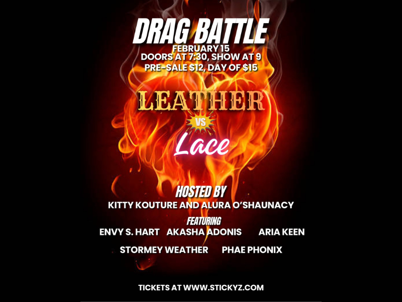Drag Battle: Leather vs. Lace brings a fierce, high-energy showdown to the stage featuring Kitty Kouture, Alura O’ Shaunacy, Stormey Weather, Aria Keen, Envy S. Hart, Phae Phonix, and Akasha Adonis. Expect bold looks, big performances, and nonstop attitude in an adults-only night of drag entertainment. Guests can choose reserved table seating or standing-room admission for an unforgettable evening of style and spectacle.
