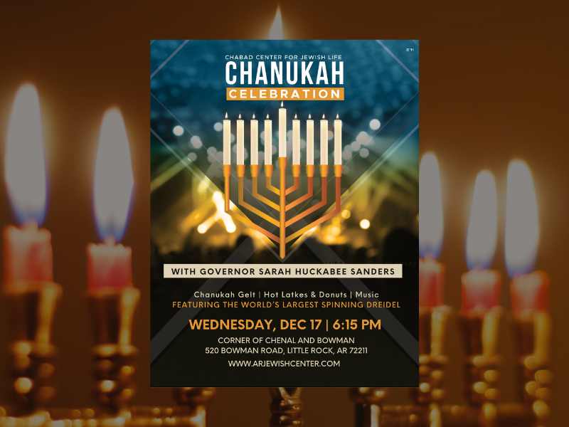 Celebrate the start of Chanukah at the annual public Menorah Lighting at the corner of Chenal Parkway and Bowman Road in front of Centennial Bank. Beginning at 6:15 p.m., the event will feature a grand menorah lighting and a Chanukah message from Governor Sarah Huckabee Sanders. Guests can enjoy individually packaged latkes, doughnuts, live music, Chanukah gelt, and the world’s largest spinning dreidel.
