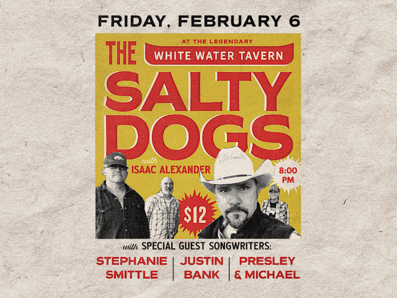 The Hip and Original Country Sounds of The Salty Dogs featuring Isaac Alexander brings an evening of authentic storytelling and roots-driven sound. The night opens with a round robin showcase highlighting local songwriters Stephanie Smittle, Justin Bank, and Presley & Michael, offering an intimate look at the craft behind the music before the full band takes the stage.