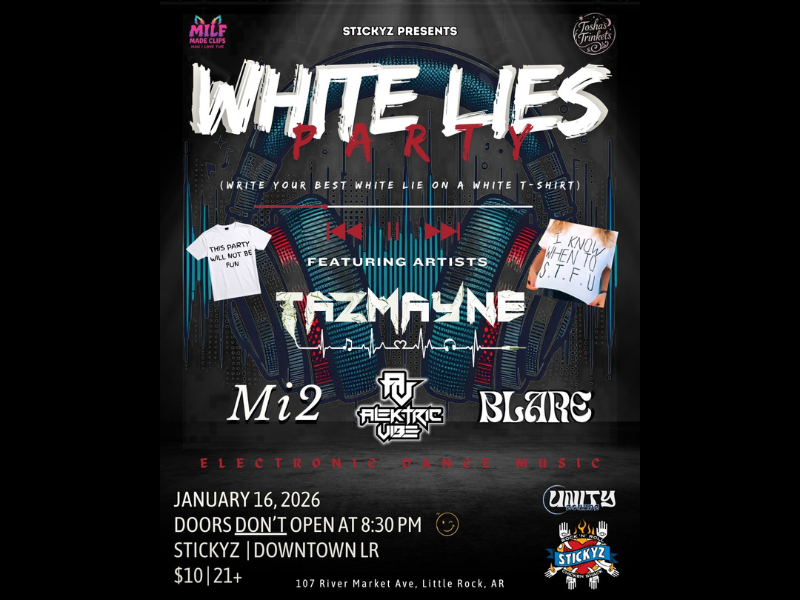 Get ready for the White Lies Party, a high-energy night of EDM, creativity, and fun. Come dressed in white and write your best “white lie” on your shirt before hitting the dance floor. Enjoy sets from top local artists including Tazmayne, Mi2, Alektric Vibe, and BLARE. It’s an unforgettable night where great music, bold style, and good vibes collide.